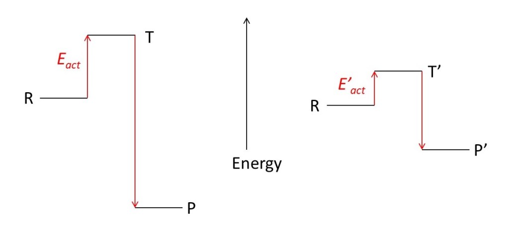 Now suppose there is a possibility of forming a different set of products, P’, that requires a lower energy transition state, T’. The energy of the reactants is independent of the products and so remains unchanged. If the energy of P’ is lower then R, the products of the reaction may be P’, instead of P, if E’act is much less than Eact. Here E’act is the energy difference between R and T’.