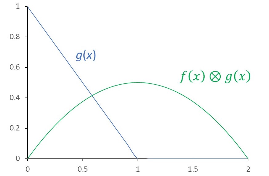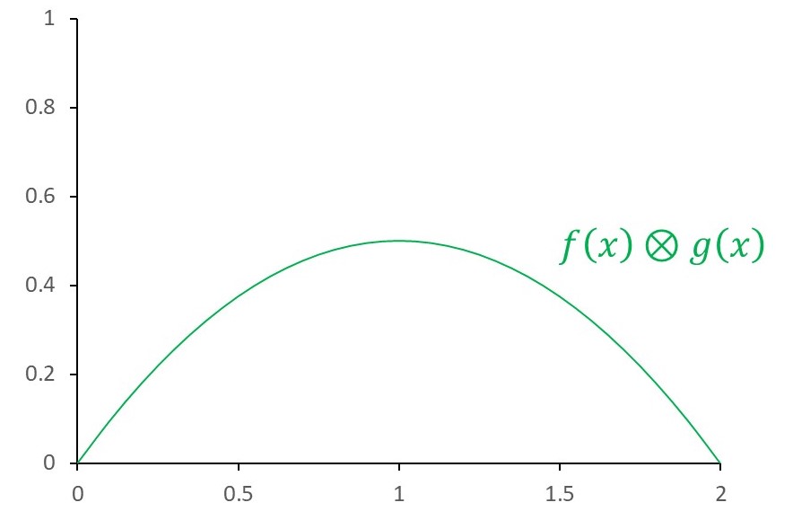 What does the convolution of two functions look like? The picture above shows two functions f(x) and g(x). The picture below shows the convolution of the two functions.