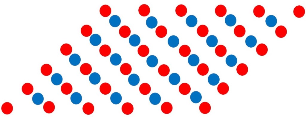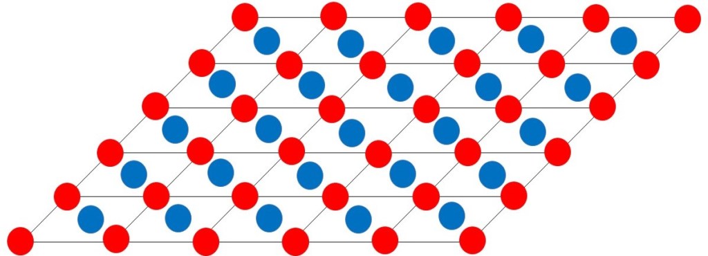 What do I mean by an “ideal crystal”? In an ideal crystal the ions or atoms (alone or bonded to form molecules) are arranged in a regular pattern in three dimensions. The picture at the beginning of this post shows a simple two-dimensional representation