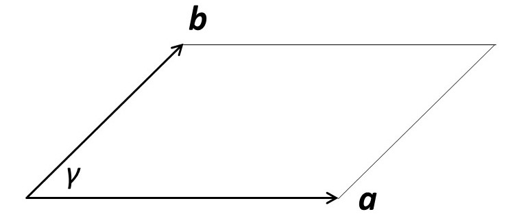 We can think of our ideal crystal as a lot of little boxes stacked together – as shown in the picture above. One of these little boxes is called a unit cell. The unit cell and its contents are the simplest structure that repeats itself in the crystal. Its dimensions and shape are defined by three unit cell vectors a, b and c – as shown, in two dimensions, in the picture below. In three dimensions, a, b and c form a right-handed coordinate system. The angle between b and c is usually called α, between a and c it is β and between a and b it is γ.