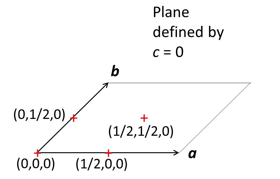 The picture above shows the positions of points (marked by the centres of red crosses) with fractional unit cell coordinates of (0,0,0), (1/2,0,0), (0,1/2,0) and (1/2,1/2,0). Fractional unit cell coordinates form a Cartesian coordinate system in which the axes are not necessarily 90o. In the picture above changing the value of y for an atom, in the b direction will change its x value, in the a direction, since γ ≠ 90o. So fractional unit cell coordinates do not form an orthogonal Cartesian coordinate system.