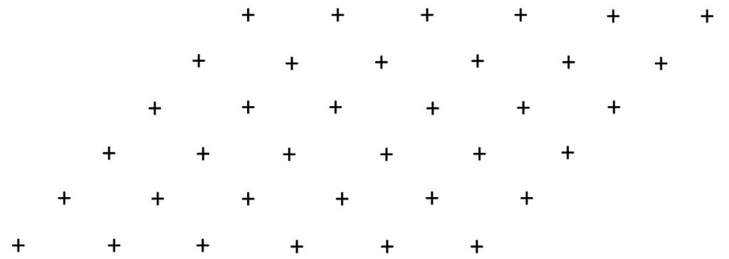 If we look at the points a = b = c = 0 for each unit cell, we see that they define a three-dimensional pattern of points – shown in two dimensions in the picture below; the positions of the points are marked by the centre of a cross. These points are called the crystal lattice or the Bravais lattice after the French physicist and statistician Auguste Bravais (1811-1863).