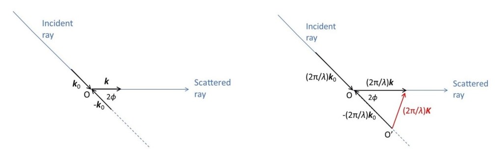 In the left-hand picture above, a ray is scattered by a particle at O. Let’s think about the ray scattered, through an angle 2ϕ by the particle. Following post 19.20, I will define the incident direction by a unit vector ko and the scattered direction by the unit vector k. The change in direction of the ray is given by (k – ko). I am now going to define the vector K by