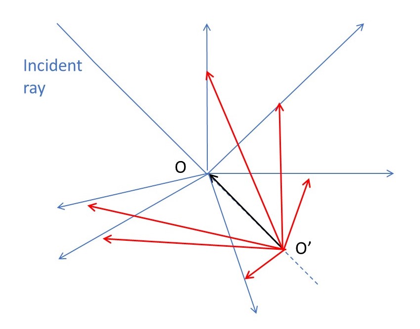as shown in the right-hand picture above. Here λ represents the wavelength of the ray, for the reasons given in post 22.14. The picture below shows that, for all scattering directions, the origin of the K vectors is at O’ that lies in the direction of k a distance 2π/λ from O, when the direction of the incident ray doesn’t change. Of course, scattered rays and, therefore, K vectors are not confined to the plane of the picture, which is a two-dimensional representation of something that happens in three dimensions. In post 19.20, we saw that the modulus of K is given by