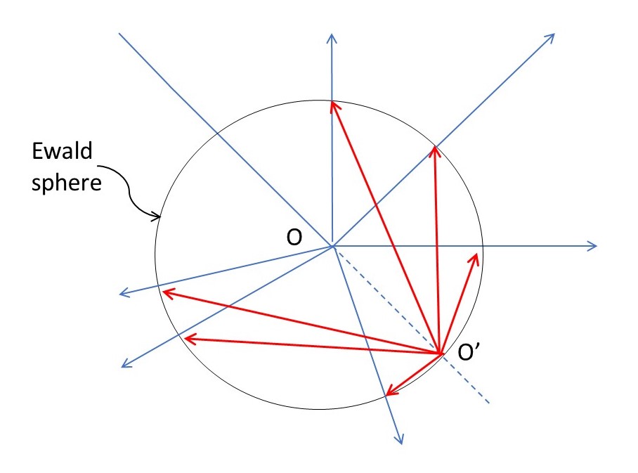 From the definition of K, in equation 1, all possible K vectors define a sphere of radius 2π/λ, whose centre is at O, the origin of real space, as shown in the picture above (where the K vectors are shown in red). The picture shows a circular section of this sphere because it is a two-dimensional representation of what happens. This is because the points of the red arrows are all a distance of (2π/λ) from O. Equation 2 implies that K-space has an infinite extent but the picture shows that, for a fixed position of the scattering object, we can only explore the region of K-space that lies on the surface of this sphere – called the Ewald sphere after the German physicist Paul Ewald (1888-1985).