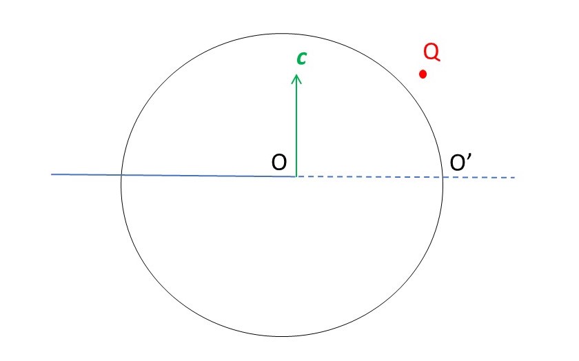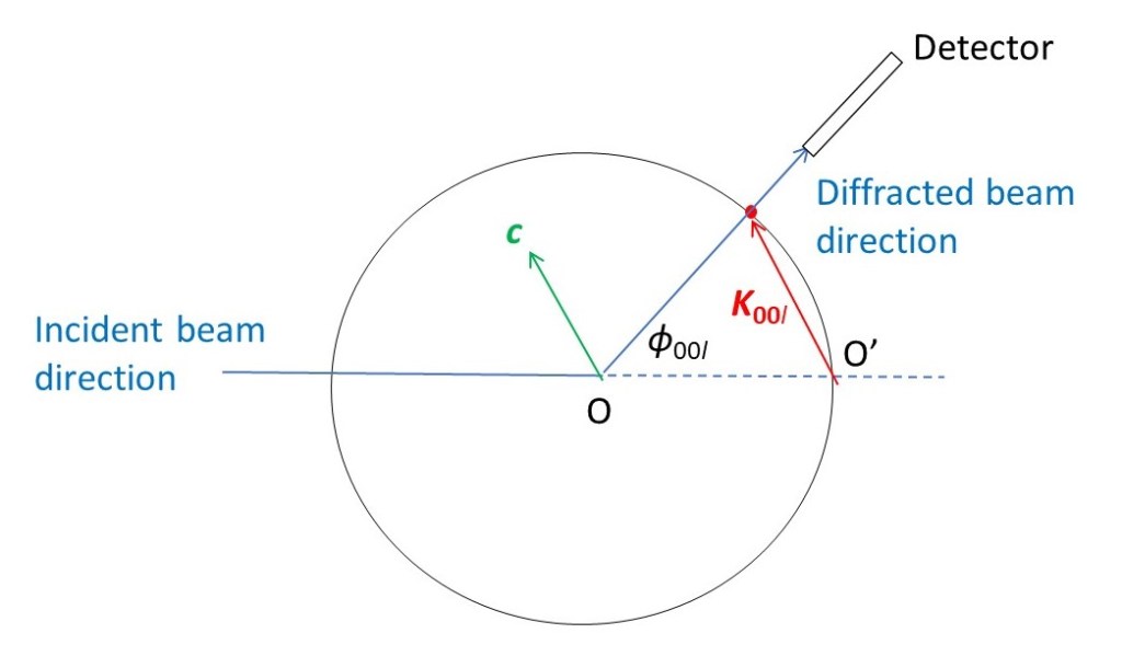 How can we make a reciprocal lattice point lie on the surface of the Ewald sphere? The picture above shows a crystal at O, the origin of real space, with its unit cell vector, c, in the vertical direction. The reciprocal lattice point at Q does not lie on the Ewald sphere. But, if we rotate the crystal (not necessarily through 360o) about c, Q will pass through the surface of the sphere. Why? Because, when we rotate the crystal, we rotate the unit cell vectors a, b and c. According to the Laue equations, we then rotate a*, b* and c* by the same angle, about a parallel axis in K-space. Then we can detect the x-rays passing through Q’, the rotated position of Q.