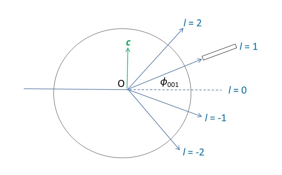 The picture below shows how, by rotating our detector, we can detect the values of ϕ00l for different values of l. If our results don’t look like this, we must adjust our axis of rotation.