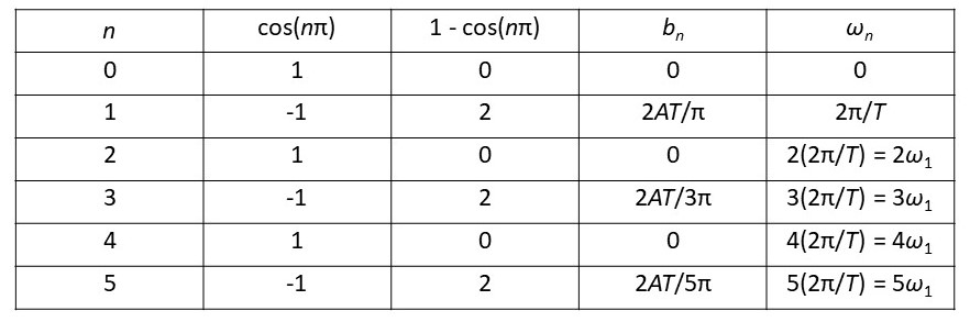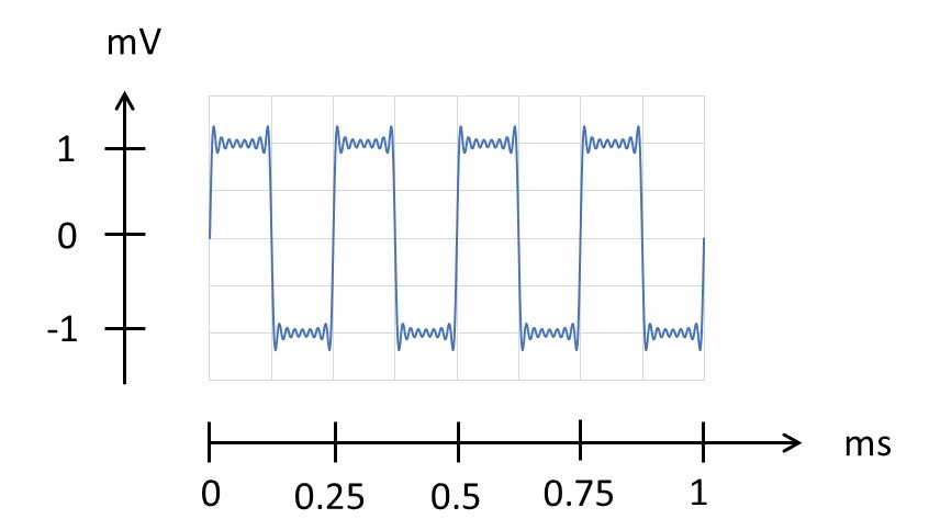 I used equation 6 (in post 18.14), putting A = 0.5 (to scale the result to give a peak of 1 mV) and T = 0.25 ms, to construct a square wave. Now we know how it was derived. Note that n = 1 defines the fundamental frequency and n = 3, 5, 7… are its harmonics. If we hadn’t recognised that our square wave was an odd function, we could have used the real part of F(ω) to calculate an and we would have then found that it is always equal to zero.