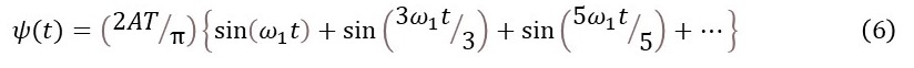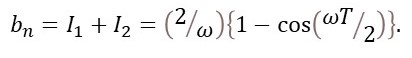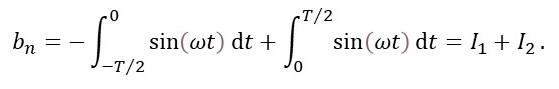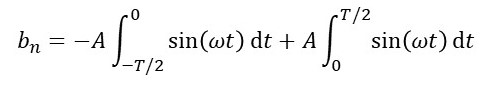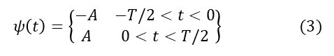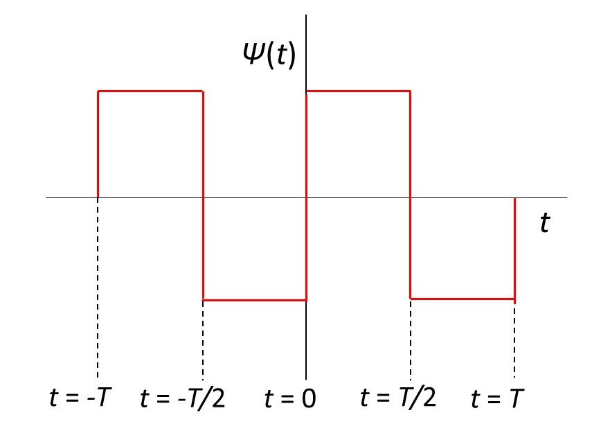The picture below shows two cycles of a square wave, ψ(t), (see the picture above) with a time period T. By defining the origin at the point shown in the picture, ψ(t), is defined as an odd function (like sine) that is ψ(t) = – ψ(-t). By contrast, a function like cosine is an even function because cos(t) = cos (-t) (see post 16.50).