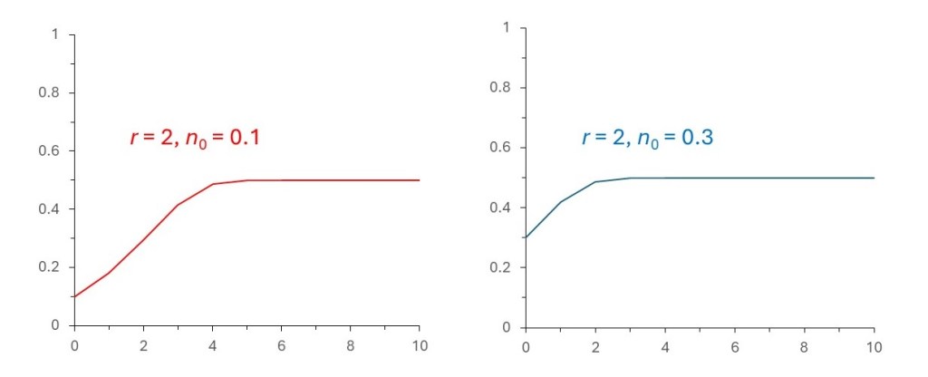 Now I am going to use an alternative approach that is mathematically simpler – the application of a recurrence relation. In this approach we consider change to take place in discrete steps or generations. This is similar to the approach I used to introduce exponential growth in post 16.5, although I didn’t explicitly write down the recurrence relation for exponential growth.