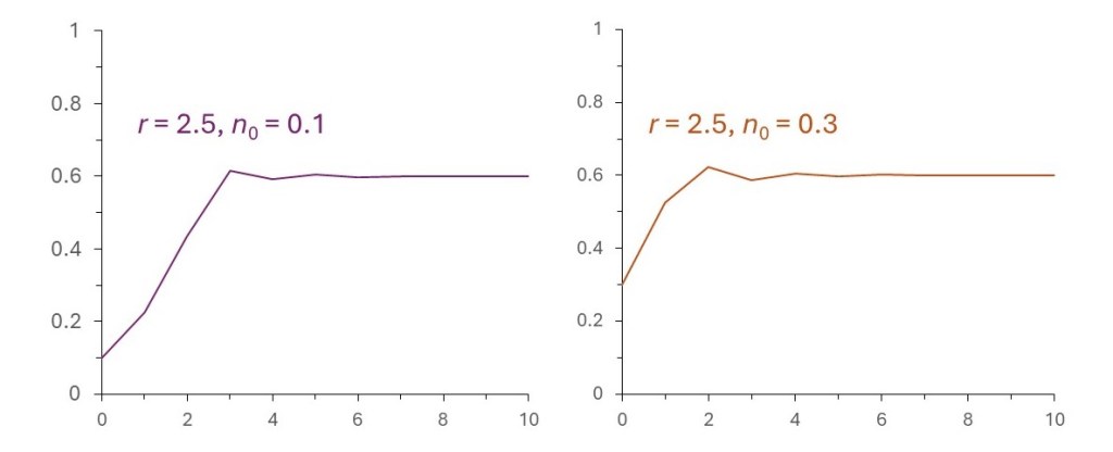 The picture above shows how xi, for a population varies when r = 2 for two different values of x0. As we might expect, from post 24.3, xi settles to a steady number – in this case 0.5.