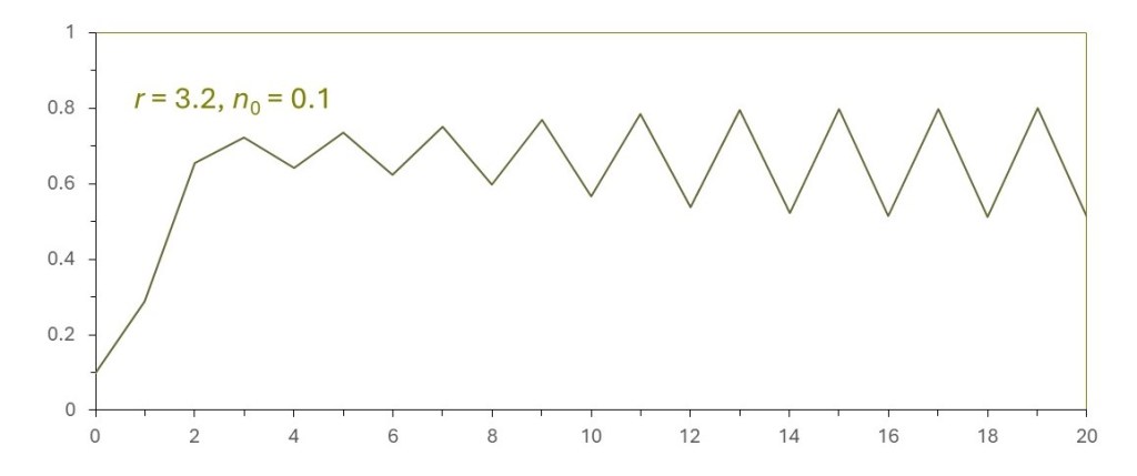 But when r = 3.2 the results are unexpected because xi oscillates between the two values of 0.5 and 0.8, as shown in the picture above. If you observed this behaviour in a real population you might look for explanations for the increase between generations 13 and 14, for example, or for the decrease between generations 4 and 5. You might even be alarmed that something is going wrong. But you wouldn’t find a simple explanation and there is no cause for alarm – the changes are a result of the value of r for that population. According to appendix 1, it is a result of the rate of increase of the population and the rate at which it decreases. And describing the size of the ith generation by xi involves the greatest possible number of individuals in the population that depends on factors like the availability of food.