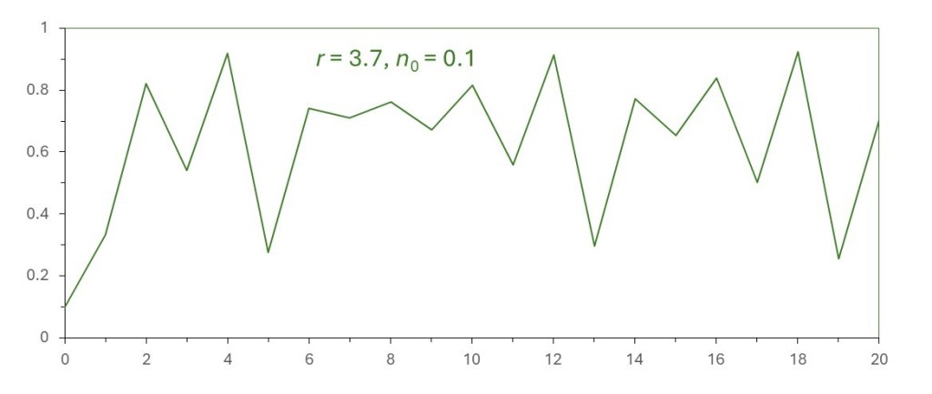 Now equation 1 is showing chaotic behaviour. The result is chaos. What do I mean by “chaos” here? The pattern shown in the picture above is so unpredictable that it appears random. But is isn’t random because it can be predicted if we know that it follows equation 1. This apparently random behaviour is “chaos”.