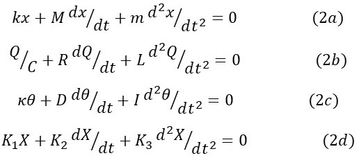 In equation 1a, m represents the mass of an object subjected to the force, M(dx/dt) is the drag force acting on it and k represents the stiffness of the system. In equation 1b, L is the inductance of the circuit, R is its resistance and C its capacitance. All this is explained in post18.24. In equation 1c, I, D and κ are the rotational analogues of m, M and k, respectively, as explained in post 17.39. In general F, x, T and θ will be vectors. But here I am going to consider displacement along a line and rotation about a fixed axis, so I can represent them by scalars in this post.