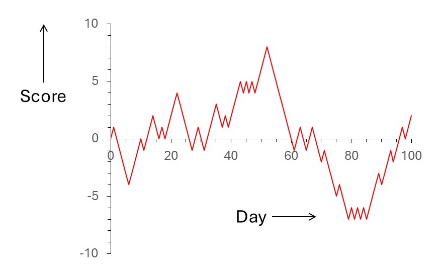 To produce the picture, I started on day 0, with a score of zero. I tossed a coin to decide what happened on subsequent days. If a got a “head”, I added 1 to the score for the day before. If I got a “tail”, I subtracted 1. Try this for yourself.