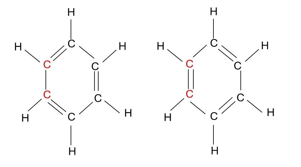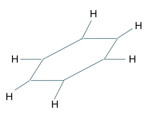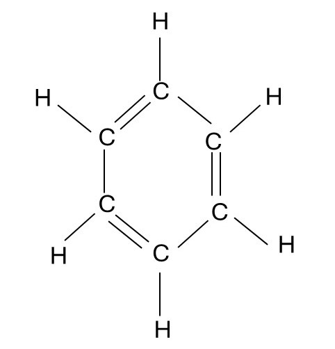 The formula of benzene is often written as shown in the picture above. The molecule shown here is a ring of six carbon atoms joined by alternating single and double covalent bonds. There is also a hydrogen atom bonded to each carbon atom. This structure was first proposed by the German chemist August Kekulé (1829-1896). (If you think his name appears to be French, it’s because his father changed it from the original German spelling of Kekule.)