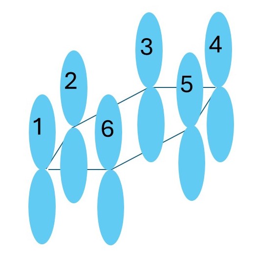We now need to form a π bond by overlapping the pz orbitals that are perpendicular to the (xy) plane of the molecule. These pz orbitals are shown in the picture below. (I have omitted the hydrogen atoms to keep the picture simple.) But do we overlap orbitals 1 with 2, 3 with 4, and 5 with 6; or do we overlap 2 with 3, 4 with 5, and 6 with 1? We have no way of making a choice and the atoms have no way of choosing how to share their electrons. So we have a problem. One way to overcome it is to abandon the valence bond theory and describe the benzene molecule using the molecular orbital theory in which the electrons can be shared in delocalised π molecular orbitals (see post 16.31). We’ll return to this conclusion later. But first let’s look at some experimental evidence.