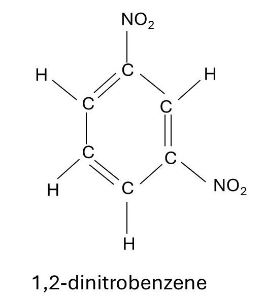We can use x-ray crystallography to find the positions of atoms in molecules and so determine the lengths of bonds between atoms (see post 23.4). Benzene is a liquid, at room temperature, but many of its compounds are solids and their molecular structures have been determined by x-ray crystallography – an example is 1,3-dinitrobenzene (see picture below). The length of a C-C single bond is always about 0.15 pm and the length of a C=C double bond is always about 0.13 pm. But the lengths of the bonds between the carbon atoms in a benzene ring is about 0.14 pm. So the bond lengths between all the carbon atoms in the benzene ring are all equal and are mid-way between the lengths of a single bond and a double bond.