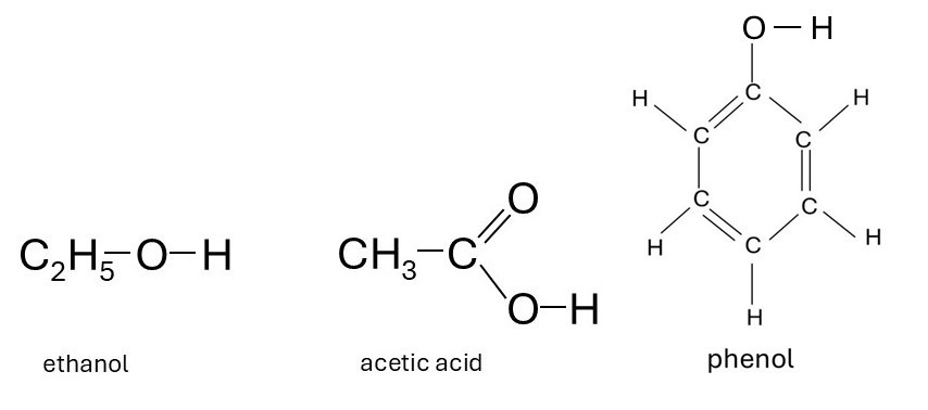 The purpose of this post is to show how we can use the idea of a resonance hybrid to explain the relative acidity of acetic acid (also called ethanoic acid – the acid that gives vinegar its flavour), ethanol (the alcohol in alcoholic drinks) and phenol (also called carbolic acid, benzoic acid and benzenol) – their formulae are shown in the picture above. When I call them “organic acids”, I am using the adjective “organic” in the sense described in post 24.9.