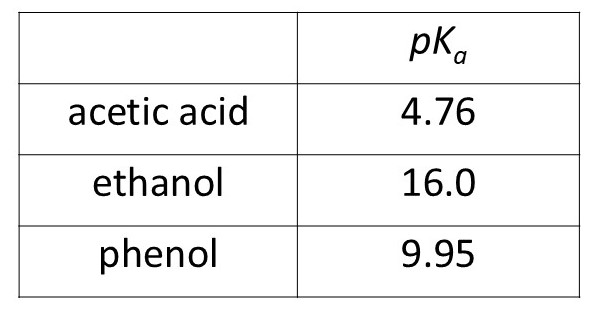 According to the definition, stronger acids have a lower value of pKa. The values of pKa for acetic acid, ethanol and phenol are shown in the table below.