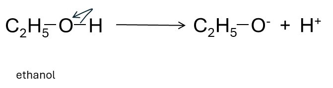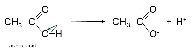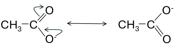 Now let’s look at the cation produced by breaking the O-H bond in ethanol. The only way to represent its structure is shown in the picture above. But when we look at the cation produced by breaking the O-H bond in acetic acid, we get a structure that can be represented by two resonance hybrids, as shown in the picture below. Here the curly arrow doesn’t represent a real movement of electrons as occurs in a chemical reaction because the resonance hybrids exist only in our imagination – they show that electrons are shared between several (in this case three) atoms (a carbon atom and two oxygen atoms). Because the electrons are shared by several atoms this cation is more stable than if they were localised on one atom, as explained in post 25.4. So acetic acid produces more stable cations and is a stronger acid than ethanol.