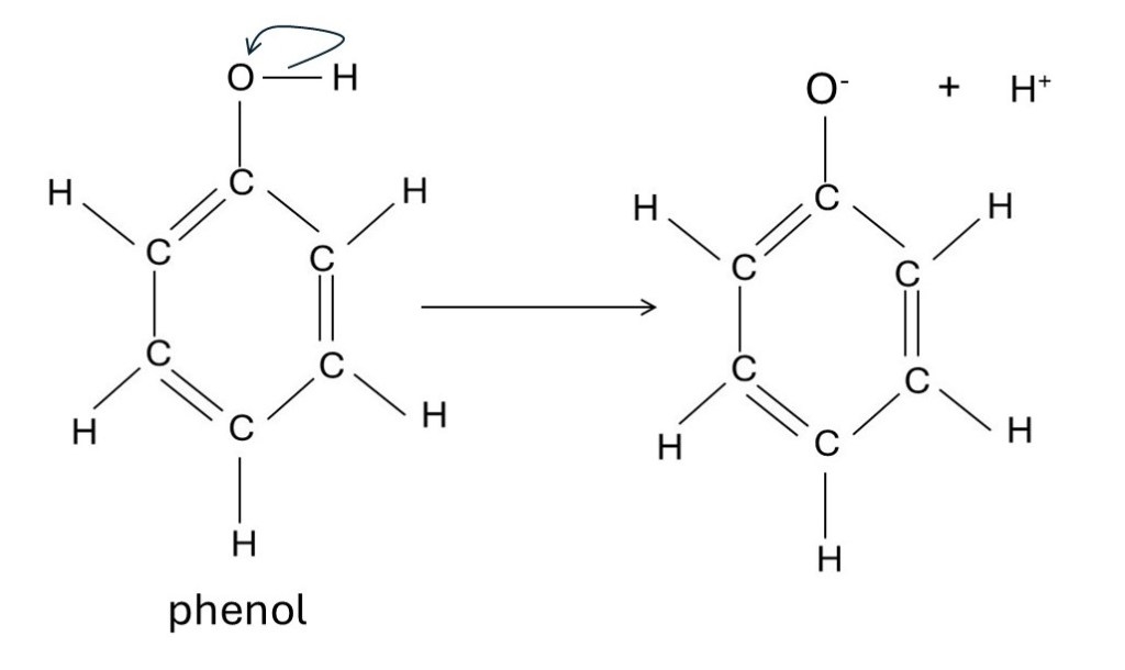 In post 17.49, we saw that acetic acid is an acid because its O-H bond breaks to provide a source of hydrogen ions (H+) and acetate ions (CH3COO–). But ethanol also contains an O-H bond but it is a much weaker acid (its pKa value is almost the same as that of water). Like ethanol, phenol has an O-H group bonded to a carbon atom but is a much stronger acid than ethanol (although weaker than acetic acid).