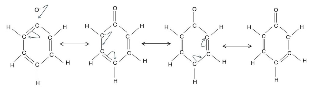Now let’s look at the cation produced by breaking the O-H bond in phenol. The picture below shows that we can represent it by four resonance hybrids, noting that the curly arrow represents movement of a pair of electrons. (You may need to represent the electrons surrounding each carbon atom by dots, to convince yourself what is happening here.) So phenol, like acetic acid, is a stronger acid than ethanol.