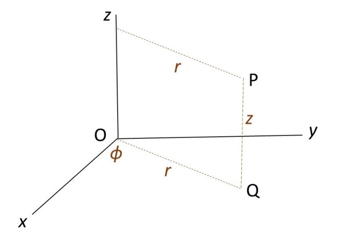 To derive this result, I’m going to think of the sphere as a stack of infinitesimal discs of thickness δz whose radius decreases from R, when z = 0, to 0, when z = R. To describe this stack of discs, I’m going to use a cylindrical polar coordinate system, origin at O, as described in post 24.12. In this system, we define the position of P by its perpendicular distance, r, from the z axis, an angle, ϕ, and a distance z, as shown in the picture below. In this picture, Q is the projection of P on to the xy plane of the Cartesian coordinate system that is also shown in the picture, so that OQ = r.