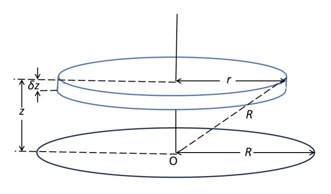 The picture above shows an elemental disc of thickness δz that is a slice of a hemisphere, radius R, that lies above the xy plane. Since δz is infinitesimal, we consider that the radii of its upper and lower surfaces to be equal to r so the area of the upper and lower circular surfaces of the disc is πr2.(see the appendix). Then the volume of this disc is