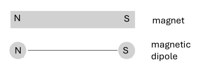One end of this bar magnet will point north – we call this the north-seeking pole, usually shortened to the north pole; the other end is called the south pole of the magnet. We can think of a magnet as two poles, a north pole and a south pole, whose distance apart is the length of the magnet, as shown in the picture above (N is the north pole and S is the south pole). This arrangement of poles is called a magnetic dipole but he poles don’t exists independently – they’re just a convenient way to help us think about magnets – see appendix 2.