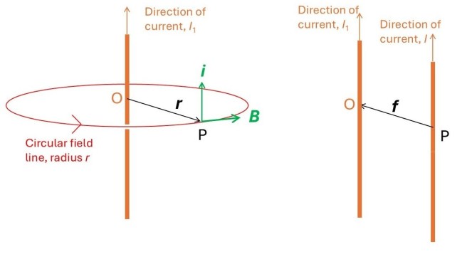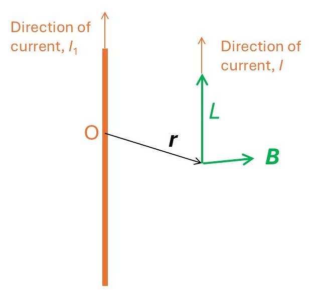 In post 25.10, I defined the magnetic field, B, caused by an electric current, I1, in a long straight wire, at a point given by a vector r, perpendicular to the wire, by