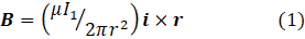 where μ is the permeability of the stuff surrounding the wire, and i × r is the cross product of a unit vector, i, in the direction of the current and r.