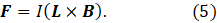 Now I’m going to define a vector L that points along this direction, in the direction in a wire of length L. Since the force between the wires attracts them to each other, its direction is given by L × B., as shown in the picture above. Then equation 4 becomes