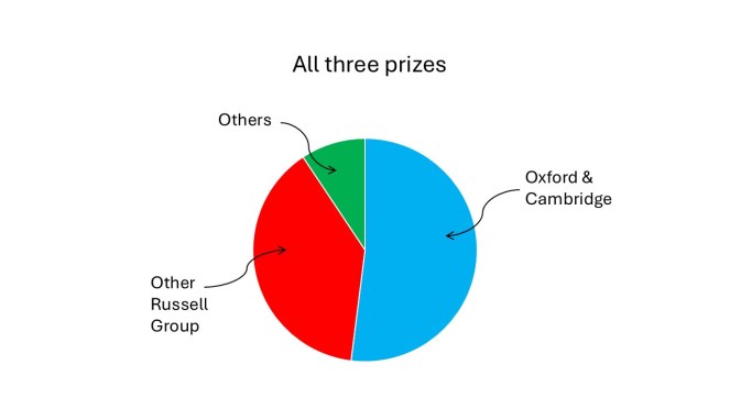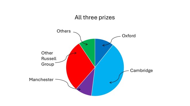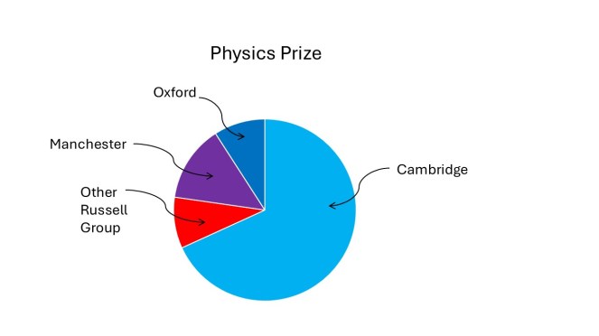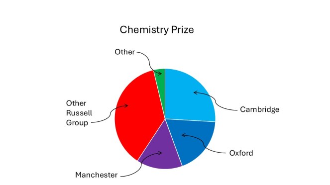 The picture above shows that non-Russel Group graduates have won the Chemistry prize but the Russell Group still dominates with Cambridge, Oxford and Manchester (in that order) responsible for a large share of the winning graduates.