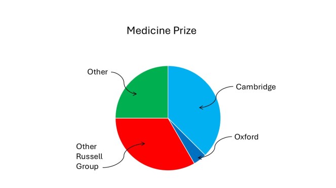The medicine prize has been awarded to roughly equal numbers of Cambridge, other Russell Group (including Oxford) and non-Russell Group institutions, as shown in the picture above. Neither Oxford nor Manchester especially stand out here.